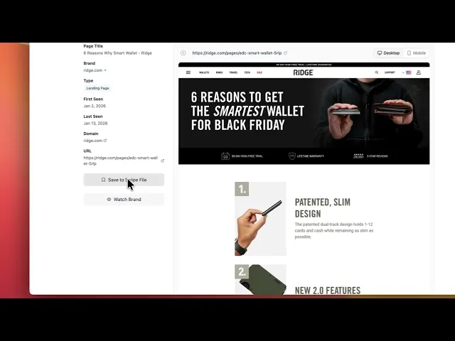 Watch brands over time, get notified when they launch new funnels, and save pages into swipe files your team can actually reuse.